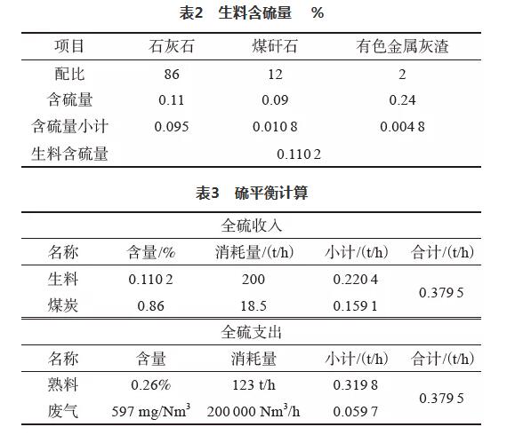 2)對窯爐系統料氣進行全硫的物料平衡,見表2、表3。