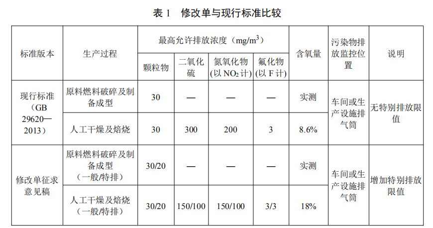 目前磚瓦行業執行GB 29620—2013,梳理標準存在的問題,對磚瓦窯煙氣 基準含氧量、重點地區特別排放限值等方面進行了修改,修改前后標準變化情 況見表1。