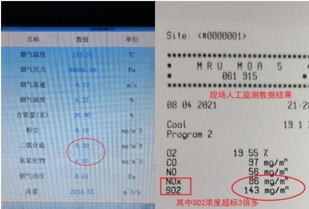 企業煙氣在線監測系統的日常運維交給第三方山西世紀天源環保技術有限公司負責。督察發現,運維公司通過在線監測數據造假等方式,掩蓋恒達公司偷排和嚴重超標排放的違法事實。煙道煙溫是判斷旁路煙氣是否偷排的重要指標,但運維公司人員在日常運維中一直上報煙溫監測設備存在故障,認為數據失真,而對煙氣二氧化硫、氮氧化物濃度長期低于10毫克/立方米的異常情況熟視無睹,裝聾作啞。經現場人工監測,煙氣實際二氧化硫和氮氧化物排放濃度分別為143毫克/立方米和86毫克/立方米,其中二氧化硫濃度超過《煉焦化學工業污染物排放標準》3.8倍,與此同時在線監測數據卻顯示二氧化硫、氮氧化物濃度分別為0.50毫克/立方米和4.05毫克/立方米,數據嚴重失真,存在造假行為。△圖7 在線監測數據(左圖)顯示二氧化硫和氮氧化物濃度分別為0.50毫克/立方米和4.05毫克/立方米;而現場人工監測數據(右圖)顯示二氧化硫和氮氧化物實際濃度分別為143毫克/立方米和86毫克/立方米。在線監測數據嚴重失真,存在造假行為。