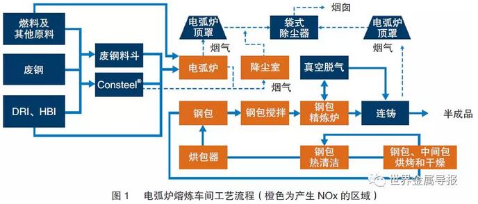 對于電弧爐熔煉車間,凡是帶有電弧或燒嘴的工藝或設(shè)備都應(yīng)被視為NOx的排放源,但正如本文后面將看到的,實(shí)際并不僅限于此。
