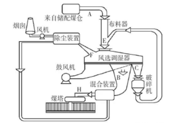 流化床煤調濕的工藝特點:該裝置位于備煤車間粉碎機后,在流化床干燥機內,利用布風噴嘴噴出高速斜向氣流使煤料流化而移向出口;只干燥和脫粉,不分級。