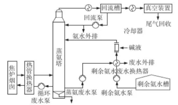 以焦爐煙道廢氣為熱源的負壓蒸氨工藝流程:剩余氨水經換熱器換熱后送入蒸氨塔進行蒸餾,蒸氨塔頂氨汽經分縮器、冷卻器冷卻后,冷卻氨水進入回流槽,槽頂不凝汽在真空裝置吸力作用下,經冷卻器冷卻后進入吸煤氣管道中;槽底氨水用回流泵抽出,一部分送蒸氨塔頂回流,一部分作為產品氨水外送。蒸氨塔底蒸氨廢水進入煙氣熱管換熱器循環加熱后返回蒸氨塔內;另一部分蒸氨廢水與原料剩余氨水換熱降溫后送廢水處理裝置。其工藝流程圖如圖5所示。