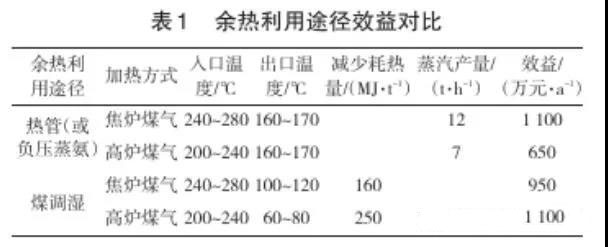 由于焦爐加熱用煤氣種類的不同,焦爐煙道廢氣余熱利用的溫度差別很大,以年產120萬t焦炭的焦爐煙道廢氣利用熱管技術生產蒸汽(或負壓蒸氨)和煤調濕技術進行對比,對比結果見表1。