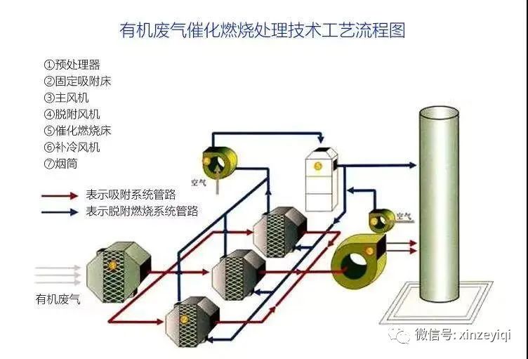 含有機(jī)污染物廢氣進(jìn)入吸附裝置,揮發(fā)性有機(jī)物大部份被吸附裝置吸附,而成為較干凈的空氣,這部份干凈的氣體排放至大氣中。被吸附裝置吸附的大部分有機(jī)污染物則進(jìn)入脫附再生區(qū),在此區(qū)完成脫附再生,該過(guò)程主要是利用高溫空氣將脫附再生。經(jīng)過(guò)再生后,吸附裝置吸附的廢氣經(jīng)脫附而成為高濃度的有機(jī)廢氣。這部分高濃度的有機(jī)廢氣進(jìn)入催化燃燒床,有機(jī)廢氣加熱到催化起燃問(wèn)題以上,廢氣經(jīng)過(guò)安裝有催化劑的床層時(shí),廢氣中的VOCs轉(zhuǎn)化為無(wú)害的CO2和水,以達(dá)到去除有機(jī)物的目的。